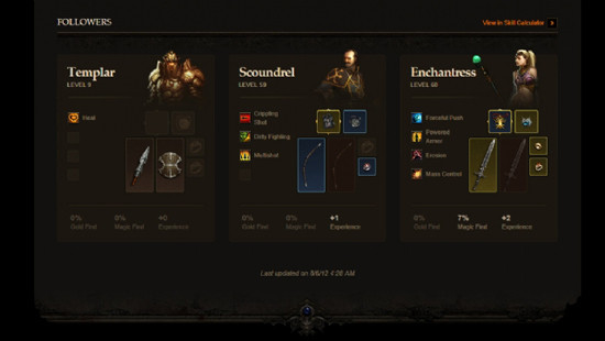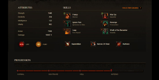 在装备栏下方,就是角色技能和属性展示,同时还包括了游戏进度。你可以直接在这个页面链接到技能模拟器,然后与你的朋友分享你的技能搭配。