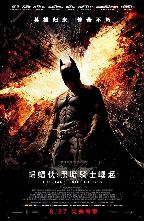 由克里斯托弗·诺兰执导的好莱坞史诗巨制《蝙蝠侠:黑暗骑士崛起》定档8月27日,该片将以2D及2D IMAX两种制式与内地观众见面。日前,官方公布了《蝙蝠侠:黑暗骑士崛起》的中文版主海报。在海报中,蝙蝠侠霸气外露,背景是高楼林立哥谭市,楼间空隙是蝙蝠形状的火焰,预示蝙蝠侠将再面临新的挑战,救哥谭市于水火之中。