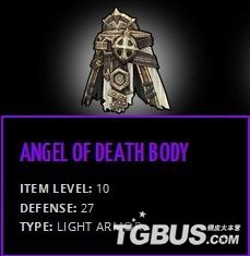 装备等级:5伤害:49-55防御:55力量:10生命回复:262、死亡天使(Angel of Death)强化的神圣护甲套装,能够保护穿着者在地狱穿行抑或越过地狱之门时不受到伤害。(在BestBuy预定游戏的话可以自动解锁。)