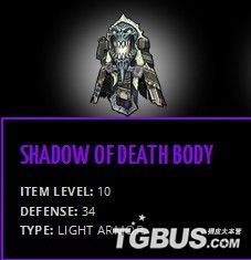 装备等级:10防御:25类型:轻甲漫游者套装并没有镰刀,不知是官网漏掉了还是确实没有。等游戏发售后视情况补完。4、死亡阴影(Shadow of Death)死亡阴影套装代表着掌控众生灵的人——Death本尊,穿着此套装可以轻松的抵达任何目的地。