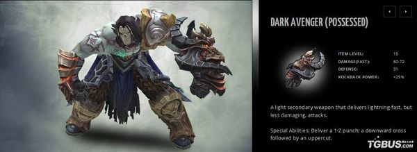 装备等级:15伤害:60-72防御:31击退:+25%(这里没有找到原文提到的"KOCKBACK的含义,所以擅自改为KNOCKBACK)特殊能力:造成投掷伤害,冲刺攻击及上勾拳二连击。黑暗金属