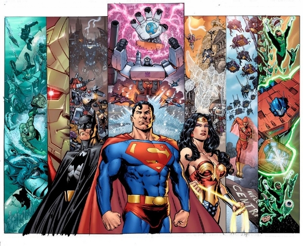 这张图片来自MidtownComics的facebook主页,不过不要激动,这只是一名叫做PhilJimenez的美术师的个人作品,并不代表有相关的游戏的研发计划。 变成绿灯侠的擎天柱、蝙蝠侠汽车人、宇宙大帝之手、神奇女侠,还有会变成隐形飞机的Seeker。水行侠大