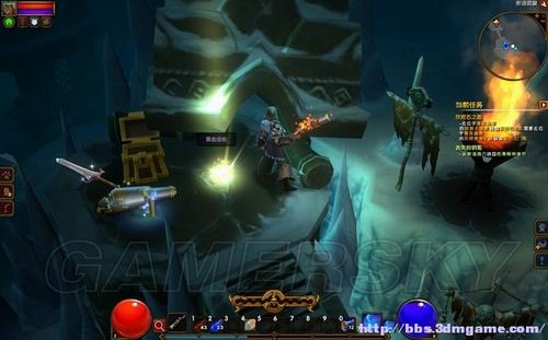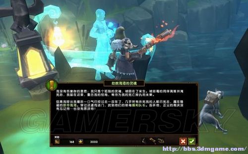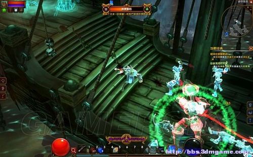 绕到海盗船上找到独眼威利,他会召唤成批的骷髅士兵,只会近战攻击,并且出手很容易判断和躲避。杀掉威利船长后,船头的两只宝箱解锁,拾取不少的药水。经由传送门回到岸边和欧尔文谈话,拿到装备奖励。