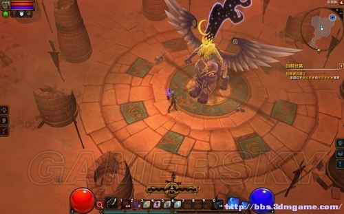 阴暗鹰穴里的怪物包括蜥蜴怪、骷髅傀儡等,多是毒属性的攻击,进入之前换上抗毒装备。有小部分的杂兵是远程射击的弓手,迅速冲过去清除。在迷宫有有名附魔师,最多可给一件装备附魔三次。进到二层打褐翼的蝎尾狮,它会召唤幼崽,释放几道龙卷风暴攻击,其余都是近身攻击,并不难打。将它打掉一半血量,空中坠落另一只黑翼的蝎狮兽,是前一只的伴侣,它会施展空中坠落石椎,和悬空释放沙尘旋风攻击。这里要绕着中央的坑穴拖着打,避免陷入夹击的境地。