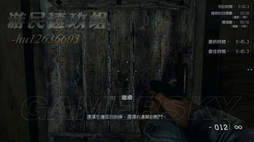 如果对您的成绩不满意可以走向左边重新再来一遍,也可走向右边的门按E继续游戏。本关结束。