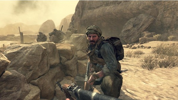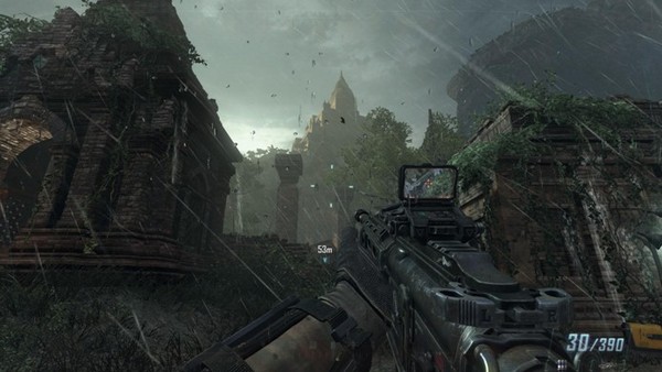 不得不说,Treyarch小组是用心良苦的。第二关,我的ALIENWARE M17x开着全特效进入游戏完全被画面给震撼了。宽广宏大的场景,有山,有水,有小溪,有瀑布,再加上广泛的色调,画面异常华丽,不失美感。从建模来说,场景建模非常到位,轮角分明,不管建筑物还是山水草地,都是有一定水准的,透视也运用的非常妥当。贴图来说的话,也是非常精确,光与影的渲染也是相当到位了。战场气氛渲染的特别棒,特别是大规模作战时的那种宏大场景能瞬间点燃你的热血。对于本作中的一些高层建筑来说,在T组强大的光辉下能将该作的破坏系统将发挥出电影《2012》那般的灾难效果。游戏还采用了3D立体视觉,让人身临其境——当然,你首先得有一台像M17x一样支持3D功能的游戏本。