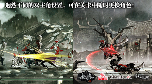 在主机游戏里,游戏中的双主角设计在动作游戏中比较常见,如《鬼泣4》中的尼禄与但丁的设定,就给予了玩家很大的体验空间。但这样截然不同的主角战斗系统设计很少出现在2D横版战斗游戏中,《闪客》的两个主角只有外形及视觉效果上的区别,即便是《胧村正》这样的游戏中,男女两个主角的技能设定及手感也近乎一致。