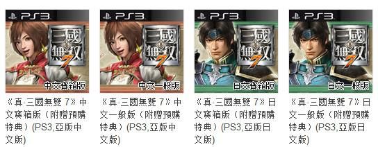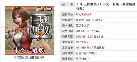 继日版发售日以及大量新武将设定图公布后,日前我们从**巴哈商城中又得到了PS3《真三国无双7》繁体中文版的发售信息。繁体中文版的《真三国无双7》将于2013年3月下旬发售,比日版(2月28日)晚了一个月,售价1980新台币(约合人民币424元),有耐心的玩家不妨等到中文版上