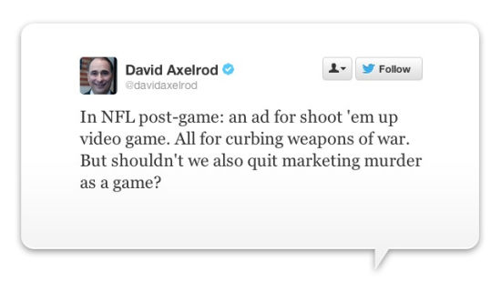 在桑迪胡克小学的枪击惨案发生之后,暴力游戏的广告依然没有停止喧嚣,游戏与电影中还是存在着大量的暴力内容,全都是让人们渴望枪杀和恐怖袭击的变相宣传,游戏与电影中的冷酷与暴力是对美国现实的无言的注释,你每天都能看见那些东西卖的热火朝天。前任奥巴马顾问戴维·阿克塞尔罗德,他帮助现