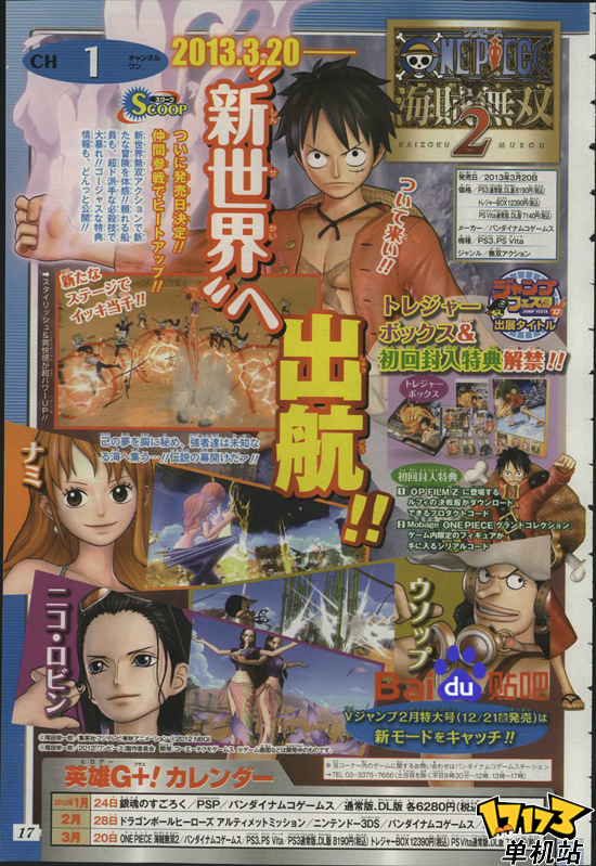 NBGI不久前公开的PSV/PS3双平台无双动作游戏《海贼无双2》在最新一期的JUMP杂志中公开了本作的发售日为2013年3月20日。