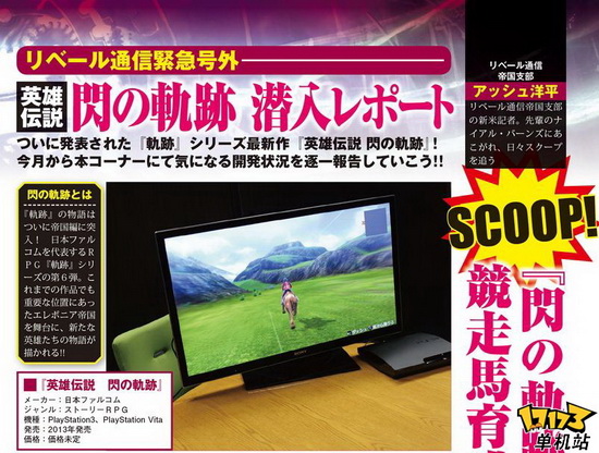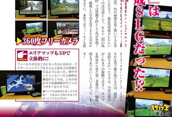 日本Falcom预定于2013年内发售的PSV/PS3双平台新作《英雄传说:闪之轨迹》近日在官方的宣传杂志中为大家带来了最新的情报。以下就是杂志的偷跑图。首先为大家公开的是一个新系统:骑马。马成为了游戏中的一种重要移动手段。游戏的场景可以360度自由旋转。而地图也变为立体的