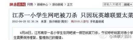 【28】去年一江苏小学生在网吧被一愤怒玩家刀杀,只因该小学生玩英雄联盟太菜,专家呼吁要理智对待小学生。。。。希望今年不会再发生这种惨剧了,同时也提醒广大小学生,珍爱生命,远离撸啊撸。