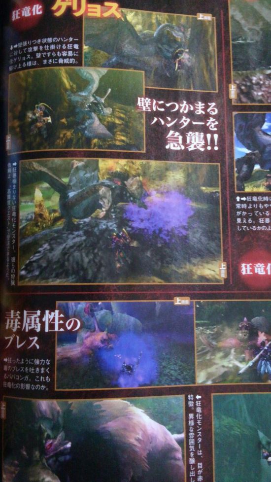 至于之前报道过的"狂龙症",不仅仅是轰龙,其他的怪物也会爆发,例如雌火龙、毒怪鸟和桃毛兽。其中,桃毛兽受到狂龙病毒的影响后,会喷出带有毒属性的吐息。也就是说,桃毛兽原本是臭属性攻击的,但是狂龙化之后却有毒属性攻击,更具危险性。
