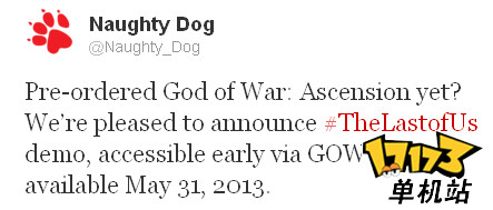 先前就已宣布将于《战神:掘起》(GodofWar:Ascension)中收录试玩版抢先玩资格的PS3末日动作游戏《最后生存者》(TheLastofUs),在《战神:掘起》发售之际,其开发团队NaughtyDog终在官方Twitter上更详尽解释试玩资格是怎么一回事。 留言中