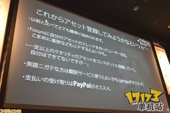 2013年4月15日-16日,由unity主办的“unitejapan2013”在东京举办。其中一项议程,介绍了unity使用者可以使用的assetstore的相关信息。 在unity里,个人开发者自己开发的用于游戏制作的asset数据,可以在assetstore里进行