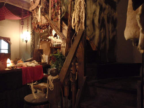 踏进去就可以看到故意做成土墙跟砖块的装潢,武器、动物毛皮以及各种老板自己手做的小道具。
