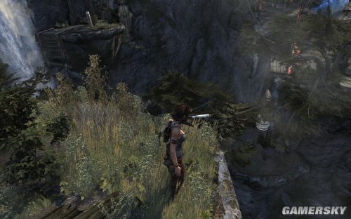 通过绳桥到达下面会遇到3个敌人,可以藏到小屋里面然后用弓箭射杀他们.