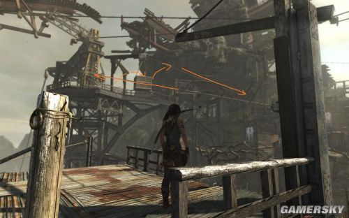 在货物上的时候朝着绳索方向大胆跳就好了。劳拉自己会捉住,落地以后会遭遇一小波敌人。