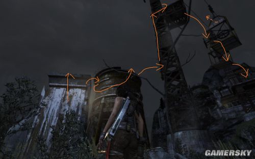 第九章:探索风暴女王之谜与众人议论后劳拉决心去山中一探究竟,CG后直走用绳索把门开,扭动开关之后从上面不断跳上去,最后爬到上方岩壁之后往左爬.来到上方,之后直走搭建绳桥去到高地.到达高地之后按下图方向爬到塔的上方.注意到塔上之后需要用绳索把吊台拉过来才能被用左垫脚石,否则距离太远