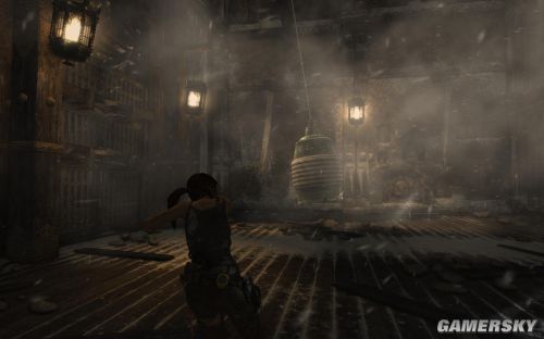 之后进入大门爬到二层在木柱旁向上方的大钟发射绳索搭建绳桥,上去以后钟会掉下来压烂地面,