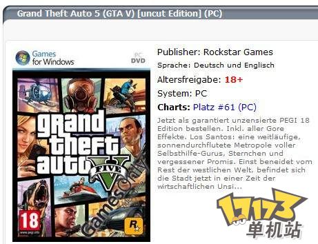 而在德国的Amazon跟GamesOnly等网络商店页面也上架了未发表的《侠盗猎车手5》PC版商品情报啰!但预购页是一回事,什么时候开卖又是一回事啦XD,没记错的话~前作四代是在家机版发售几个月后才有PC版,这回又是如何呢?就让我们耐心看下去~