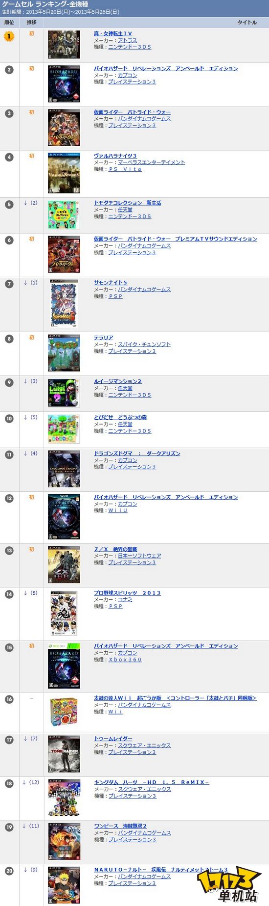 Tsutaya店铺上周排行:新作入榜,3DS《真女神转生4》空降首位;PS3《生化危机启示录 揭幕版》第2,WiiU版第12位,X360版第15位;PS3《假面骑士 BATTRIDE WAR》普通版和限定版分别占第3和第6;PSV《瓦尔哈拉骑士3》第4;PS3《Terraria》