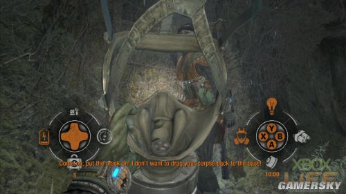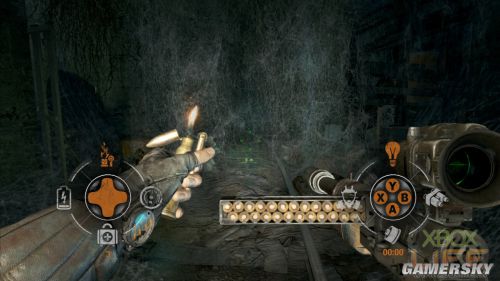 《地铁:最后的曙光》的游戏操作大致上与前作相差无几,基本的指令如:LT 键瞄准、RT 键射击、按下右类比施展近身攻击(兼具暗杀敌人的指令)、X 键更换弹匣(兼具互动键与击倒敌人的指令)、Y 键切换武器(长按可唤出目前身上所携带的武器选单)、A 键跳跃与B 键蹲下等都是玩家们相当熟悉的FPS 游戏按钮配置。而比较特殊的操作就属按住LB 键时会出现的指令选单,玩家可以在选单中透过十字键的四个方向以及XYAB 四个按键来使用一些比较特殊的物品或道具(其中十字键的上与下在一般状态中,还兼具直接开启打火机与使用医疗药剂的快捷键),例如在前往地表时就必须戴上能够抵挡毒气的防毒面具,或是开启手电筒以照亮黑暗的环境等等。