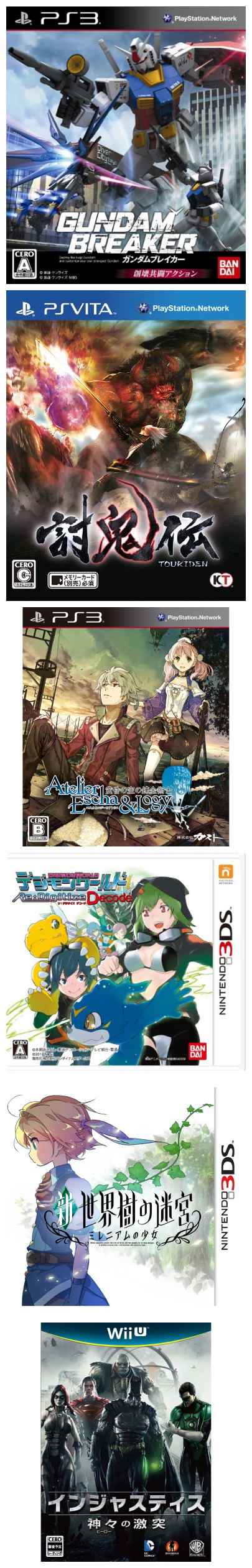 本周新作首日消化率:PS3《高达破坏者》消化率6-7成,有些店铺都来不及补货;PSV《讨鬼传》首日7成,PSP版5成;3DS《新世界树迷宫千年少女》首日消化率不到4成;PS3《艾斯卡与洛吉的工作室》首日消化5-6成;3DS《数码宝贝世界复原解码》首日不到4成;WIIU《不义联盟