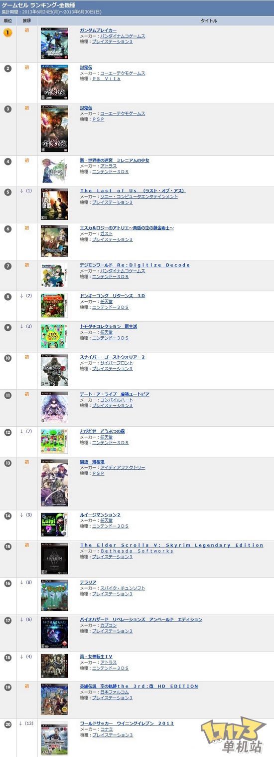 TSUTAYA店铺上周排行:PS3《高达破坏者》首位,《讨鬼传》PSV、PSP版分居第2第3,3DS《新世界树迷宫》第4,PS3《爱丝卡和罗吉的炼金工房》第6,3DS《数码暴龙世界》第7,PS3《狙击手2》第10,PS3《约会大作战》第11,PSP《里语薄樱鬼》第13,PS3《上