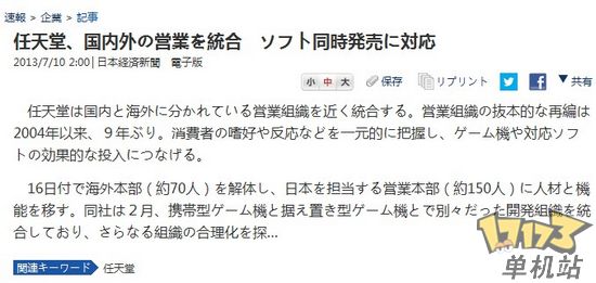 日经新闻:任天堂整合海内外发行业务,软件将全世界同时发售。根据日经新闻7月10日的报道,这是任天堂自04年以来时隔9年实行这样大刀阔斧的营业组织再编,截止16日为止海外营业本部(约70人)将解散并将向日本营业本部(约150人)转移整合,游戏将从“日本先行”逐渐变为“世界同时”发售