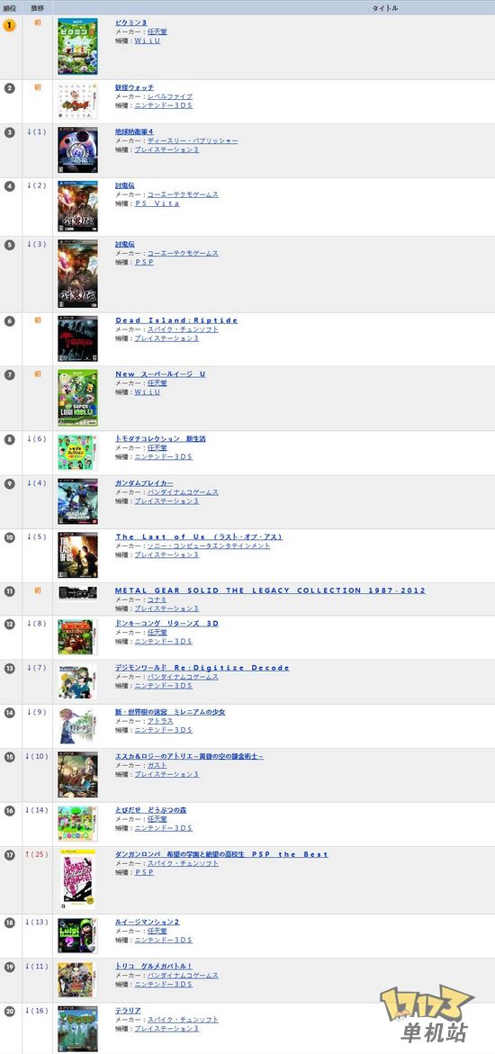 TSUTAYA店铺上周销量排行:新作WiiU《皮克敏3》首位,销量低于10万,3DS《妖怪手表》第2位,PS3《地球防卫军》第3位,PSV/PSP《讨鬼传》分居第4、5位,PS3《死亡岛 激流》第6位,Wii U《新超级路易基U》实体版第7位,PS3《合金装备 遗产收藏集》第11