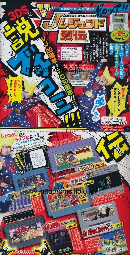 3DS平台游戏《JUMP传奇列传》杂志图,游戏将在年内发售。该作为《V JUMP》杂志20周年和红白机30周年纪念作品,原汁原味收录FC游戏《龙珠 神龙之谜》,《圣斗士星矢 黄金传说》,《圣斗士星矢 黄金传说完结篇》,《魁!!男塾 疾风一号生》,以及SFC游戏《冲!冲!恶魔君3》