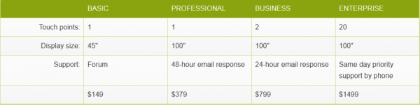 该应用的基本版本最高可支持45英寸大小的显示面,如果有需要的话也可以选择购买专业版(379美元)和Business版(799美元)支持100英寸的显示面。另外,在基础版中仅支持一个触控点,不过Business版可以提供两个,而1499美元的企业版(Enterprises edition)最高可支持20个触控点。该应用当前仅能在一台Windows 8 PC上运行,如你所看到的,它完全支持微软的“Metro”环境。在与50多个组织进行Beta测试之后,Ubi现在开始接受该软件的预订。