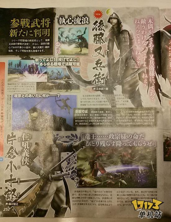 PS3平台游戏《战国BASARA4》本周完整杂志图,新武将“后藤又兵卫(CV:三木真一郎)”参战决定!另外杂志对“织田信长(CV:若本规夫)”、“明智光秀(CV:速水奖)”“片仓小十郎(CV:森川智之)”分别进行了详细介绍。