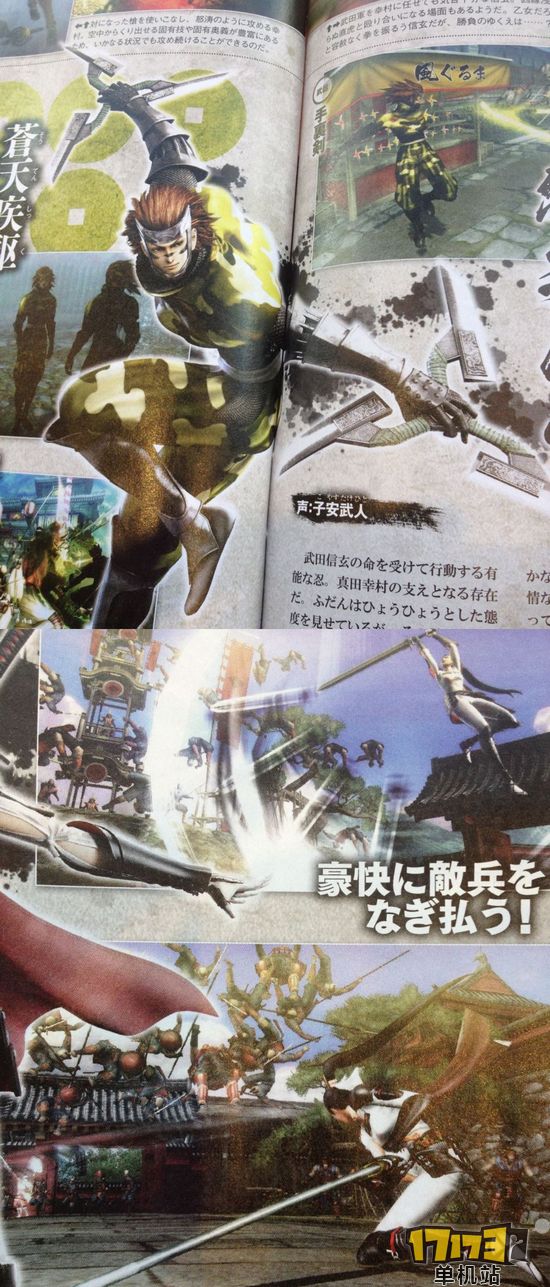 下图杂志分别为:井伊直虎(CV:坂本真绫)、真田幸村,和井伊直虎使用巨剑的战斗画面及猿飞佐助(敌武将)参战。