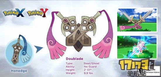 昨晚,pokemon官方facebook放出3DS平台游戏《口袋妖怪X/Y》“一突(PM详情)”的进化型:Doublabde(双刀,Double双倍的+Blade刀锋),属性:钢+鬼,特性:无防御(自身使用的技能与对手以自身为目标的技能都无视命中能力以及技能自身命中率,一定会命中,包括在飞翔、挖地洞期间都可以被击中。只影响命中,不能穿透守住、先制防御、全体防御的保护。)