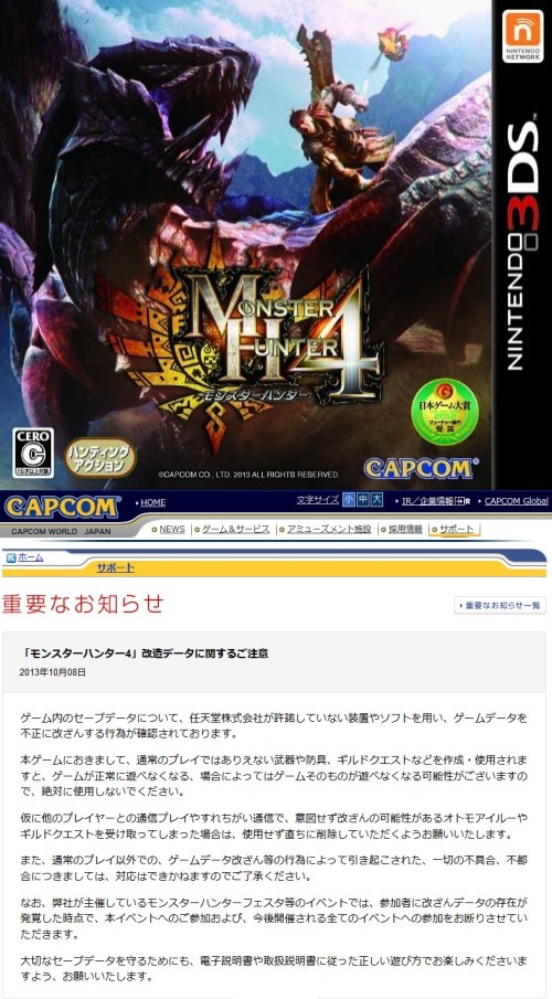 《****4》修改数据者可能将被禁止游戏本身,通过擦肩通信等接收到疑似修改过的艾露猫和公会任务,请立刻删除不要使用。