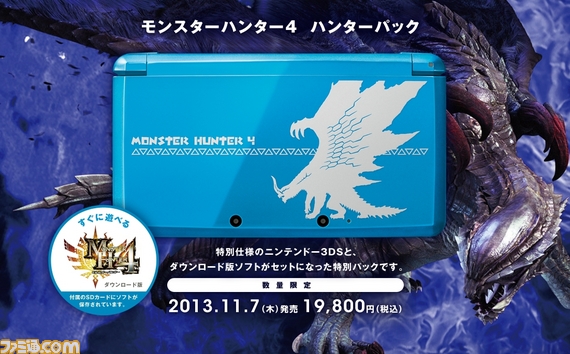 《怪物猎人4》新内置游戏同捆版3DS主机今日官方公开!售价19800日元。游戏将以下载版本形式内置于随机附赠的SD卡中。