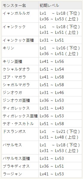 在本作的公会任务登场的怪物有下面18种。从其他玩家那里获得公会任务和擦肩通信公会任务会暂时回到初期等级,各怪物有着初期等级的上限和下限。在受信的时点,不符合下面条件的公会任务就是改造数据。