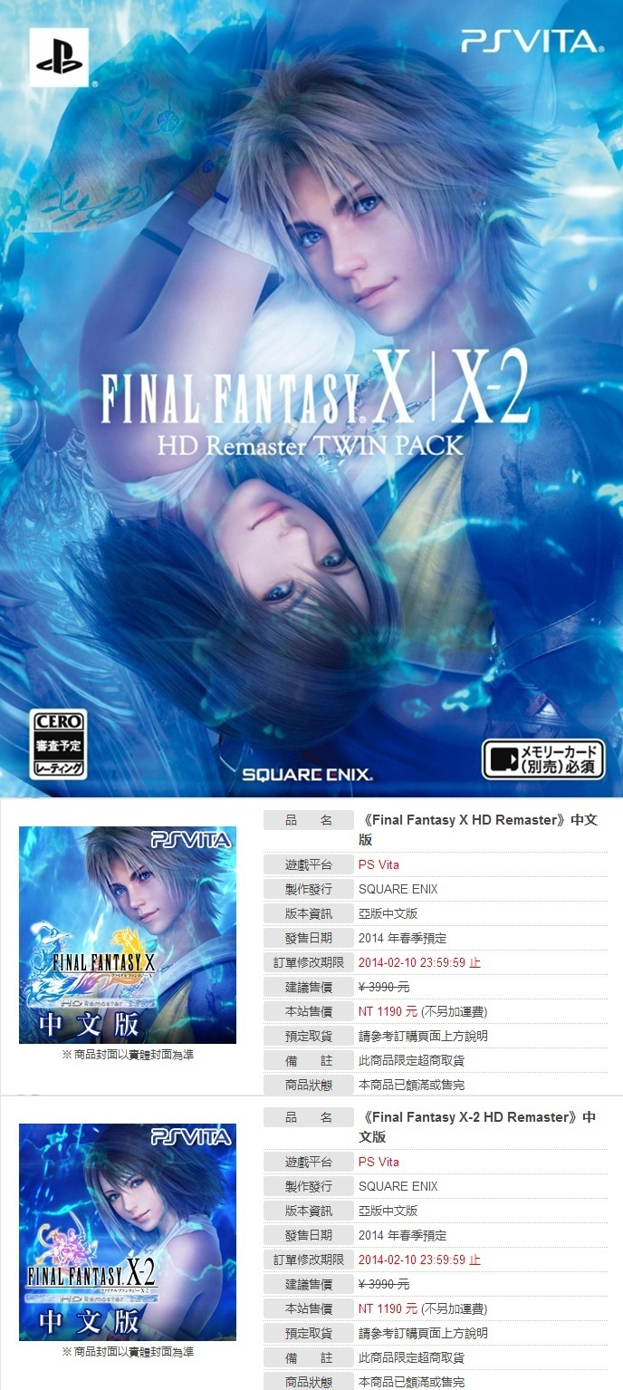 PS3/PSV平台游戏《最终幻想10/10-2 HD重制版》中文版或将延期至2014年4月以后,情报源一向较准确的**巴哈姆特商城于今天同时开放了日文版及中文版的预约,中文版页面显示发售日期竟为2014年春季,**索尼官方脸谱此前确认中文版将同步发售,但今天却含糊其辞的表示“中文