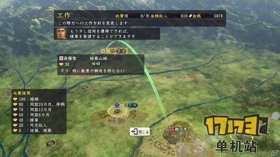各个玩家对各势力的“外交姿态”保持着高度的关注。这个“外交姿态”,信用获得的难以程度而变化。在这里今川家一追对织田家族的外交姿态采取“敌对”状态。因此,难以变成信任的状态。