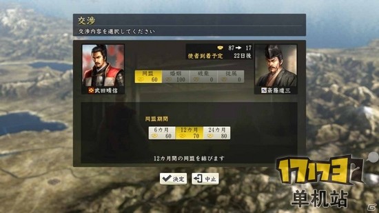 玩家的武田家,和斋藤家结成同盟的画面。同盟是根据时间和“信用”程度而改变的。现在的信用是“87”,所以自主的选择哪个势力结成同盟是有期间限制的。