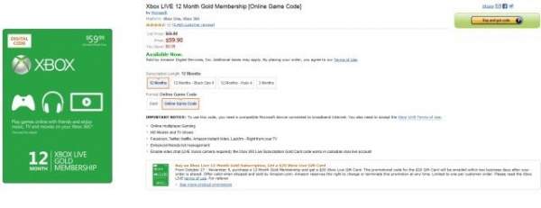 就在我们离11月22日越来越近的时候,微软和亚马逊又联手推出了一项促销活动:无论用户购买了下一代Xbox One还是当前的Xbox 360游戏主机,都能够获赠为期12个月的Xbox Live订阅服务。此外,亚马逊也在今天放出了限时促销,如果消费者购买为期1年的Xbox Live会员服务(59.90美元),就能够获赠20美元的Xbox Live礼品卡。