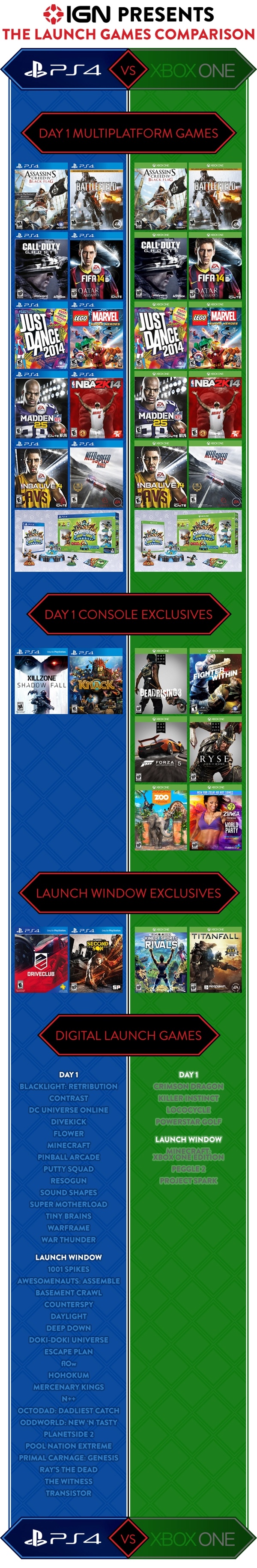 针对上述观点,知名游戏网站IGN表示严重同意,并及时制作出了一张PS4和Xbox One初期游戏整容图表,其中包含“首发多平台”、“首发独占”、“初期独占”以及“数字游戏”四大分类。