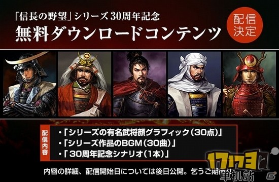 此外,游戏发售后还将进行“系列****** 免费DLC”配信,本DLC共有名武将头像30枚,BGM30首等。配信日将于发售日当天公开。