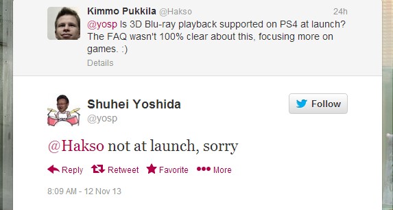 索尼全球工作室总裁吉田修平日前在推特上表示PS4在上市时亦不支持3D 蓝光技术。