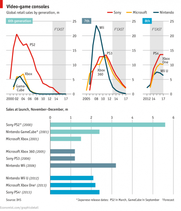 IHS分析预测PlayStation 4和Xbox One都有望在2014年前发售超过200万台,将会勉强超过Wii U的发售数字。Wii U发售过于急促导致在今年年初发售的时候并未达到很好的销售数字,所以索尼和微软都在避免重蹈这些覆辙。下面是IHS公司对游戏主机的零售额的图表: