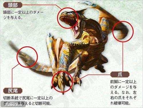 | 可破坏部位 | 脸部 | 破坏报酬 | 轟竜の甲殻、轟竜の頭殻、轟竜の牙x2(下位)、轟竜の鋭牙、轟竜の堅殻、轟竜の頭殻、轟竜の牙x3、轟竜のアギト(上位) |