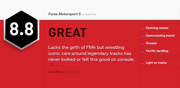 离微软的次世代游戏主机Xbox One发售已不足两日,越来越多的相关消息开始透露出来。今日,外媒发布了Xbox One护航竞速大作《极限竞速5》的首批评分,各家分数都颇为不低,看来对这款作品相当满意。