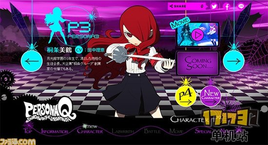 Atlus今日更新了3DS《女神异闻录Q(ペルソナQ シャドウ オブ ザ ラビリンス)》的游戏官网,增添了桐条美鹤、花村阳介、山岸风花、久慈川理世的角色介绍之外,还公开了桐条美鹤、花村阳介的角色介绍视频。